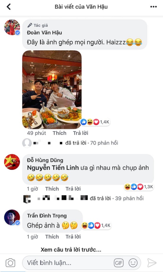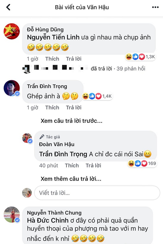 "Thầy Chíp" Đỗ Hùng Dũng thậm chí kéo tiền đạo Nguyễn Tiến Linh vào, dí dỏm bình luận: "Nguyễn Tiến Linh, ưa gì nhau mà chụp ảnh". Trong khi đó, trung vệ Trần Đình Trọng lại trêu đùa: "Ghép ảnh à?".