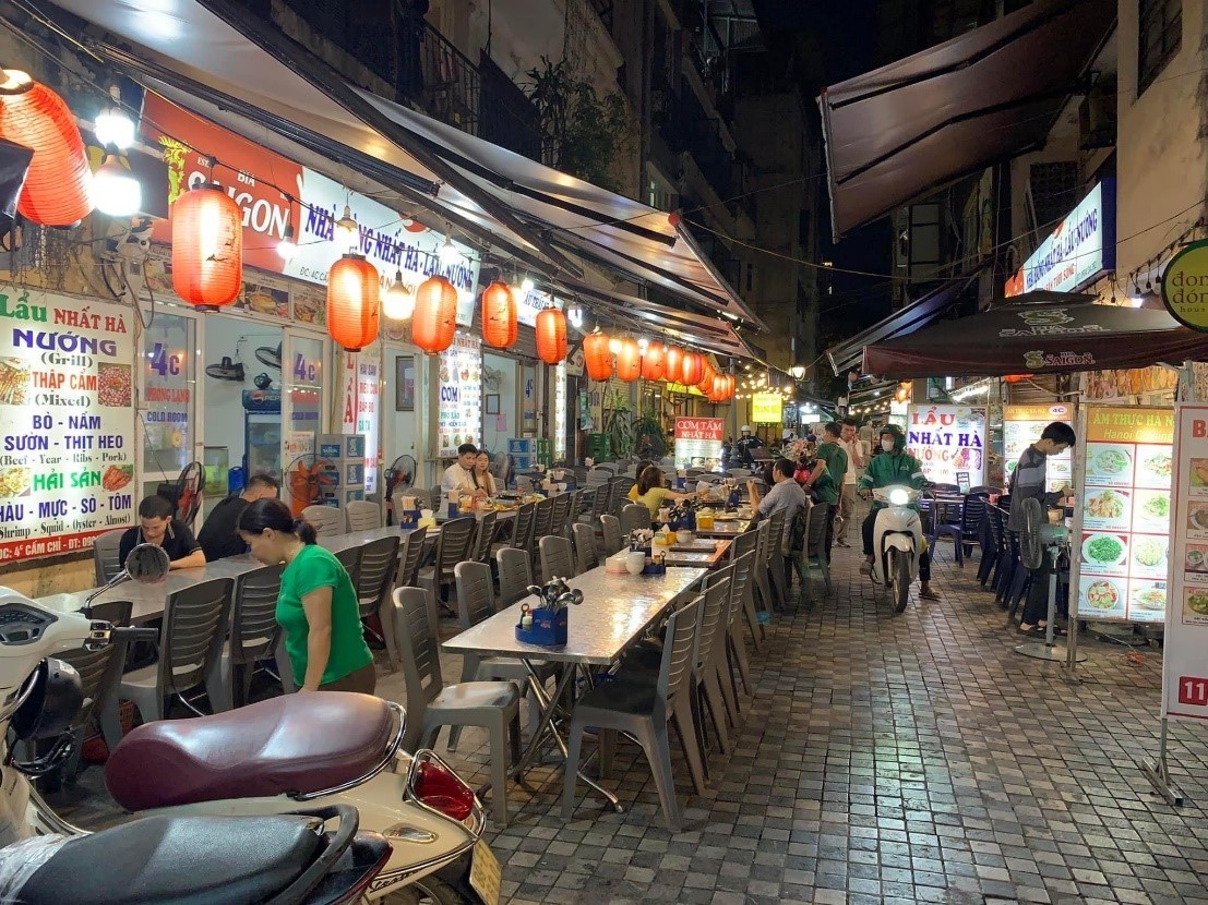 Phố Tống Duy Tân dài khoảng 200m, kết hợp với ngõ Cấm Chỉ dài khoảng 70m hình thành một khu vực hình chữ T. Trong khu vực nhỏ hẹp này, nhiều hàng quán mọc san sát nhau. Trên các bàn ăn đặt san sát nhau, khói từ thức ăn bốc lên nghi ngút. Tiếng cười nói rôm rả, tiếng cụng ly cộp cộp vang liên hồi hòa tiếng nói đùa rôm rả và những tiếng cười sảng khoái. Chủ quán và nhân viên liên tục mời chào khách ghé quán, đon đả và thân thiện.