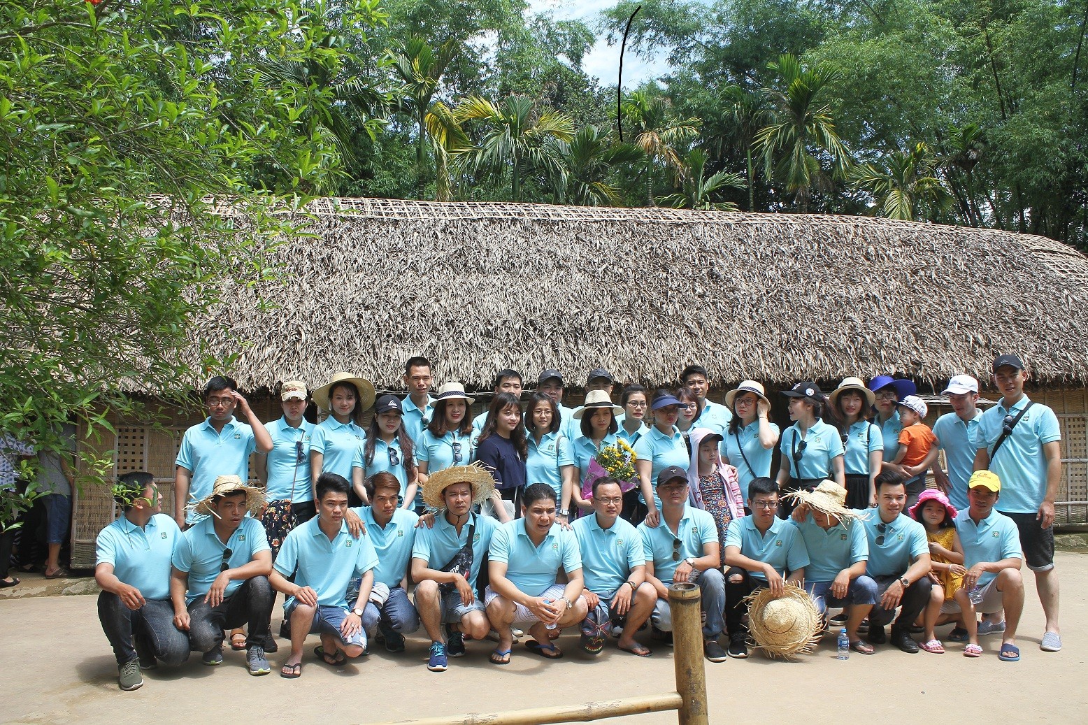 Đoàn khách của tỉnh Hải Dương cùng nhau chụp ảnh lưu niệm khi đến tham quan Làng Sen quê Bác.