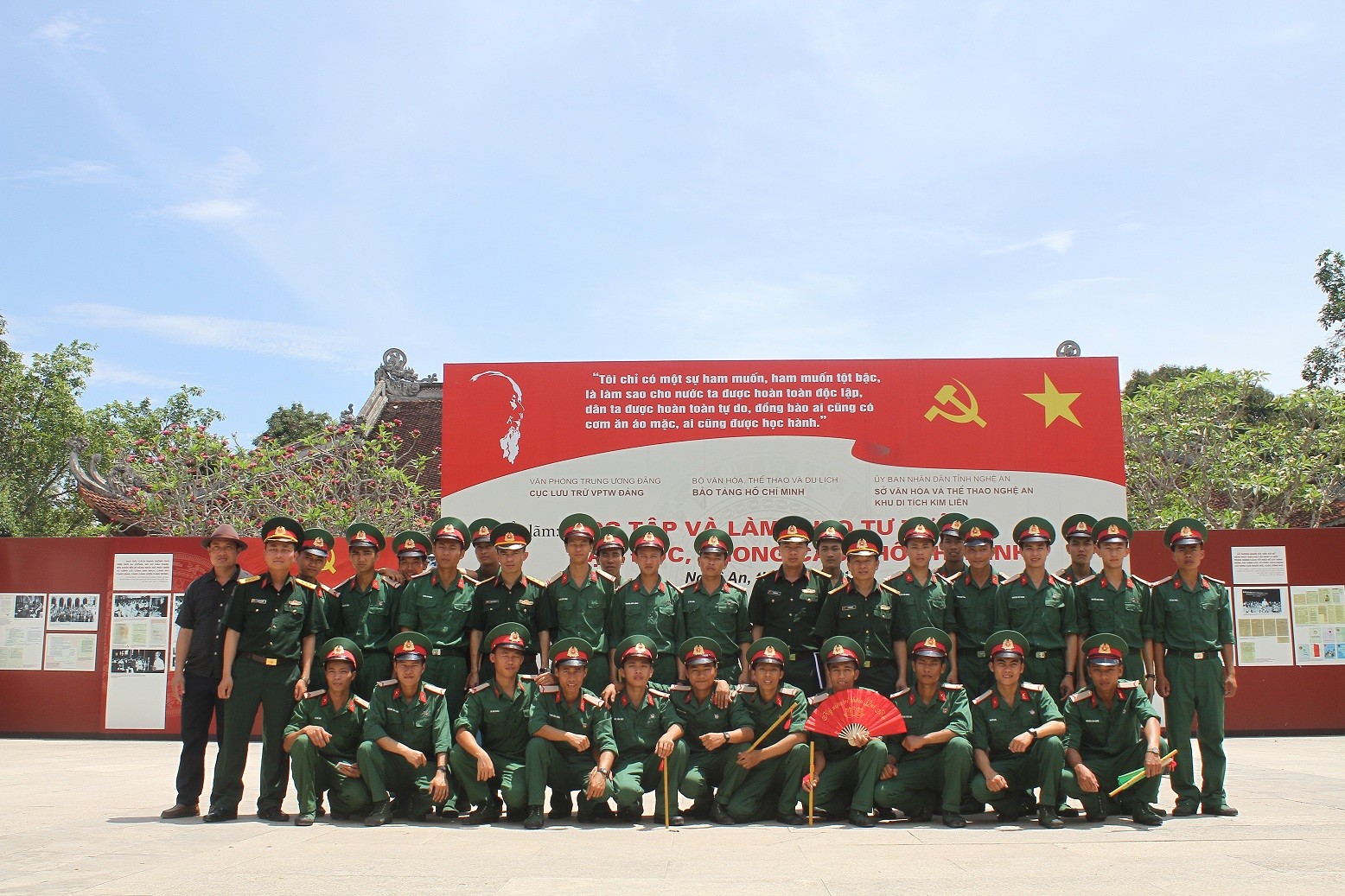 Các tân binh của Lữ đoàn 16, đóng trên địa bàn xã Quỳnh Châu, huyện Quỳnh Lưu, tỉnh Nghệ An đến Làng Sen tham quan. Họ đến đây, được hướng dẫn viên khu di tích thuyết minh về con đường cách mạng của Chủ tịch Hồ Chí Minh.