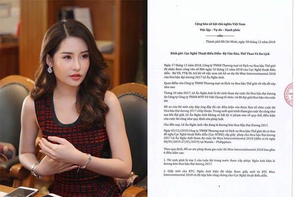 Trước đó, ngày 3/12, Công ty TNHH Thương mại và Dịch vụ Hoa hậu Thế giới nộp hồ sơ xin cục NTBD cấp phép cho Lê Âu Ngân Anh tham dự cuộc thi Hoa hậu liên lục địa (Miss Intercontinental 2018).