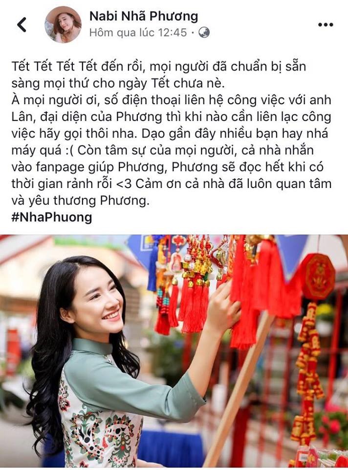 "Tết Tết Tết Tết đến rồi, mọi người đã chuẩn bị sẵn sàng mọi thứ cho ngày Tết chưa. Mọi người ơi, số điện thoại liên hệ công việc với đại diện của Phương thì khi nào cần liên lạc công việc hãy gọi thôi nha. Dạo gần đây nhiều bạn hay nhá máy quá. Còn tâm sự của mọi người, cả nhà nhắn vào fanpage giúp Phương, Phương sẽ đọc hết khi có thời gian rảnh rỗi", Nhã Phương nhắn và tuyệt nhiên không một lời nhắc về tin đồn xung quanh.