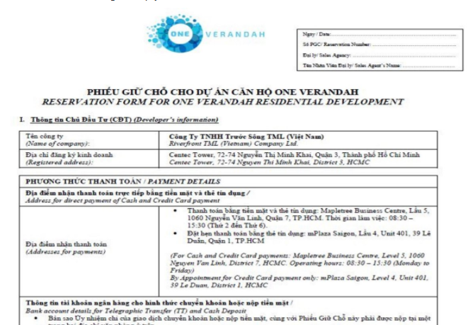 Tuy nhiên, khi chúng tôi yêu cầu chuyển một số thông tin pháp lý dự án để làm cơ sở mua căn hộ thì L. chần chừ, thoái thác. Sau đó, người này chỉ chuyển “phiếu giữ chỗ cho dự án căn hộ One Verandah”.