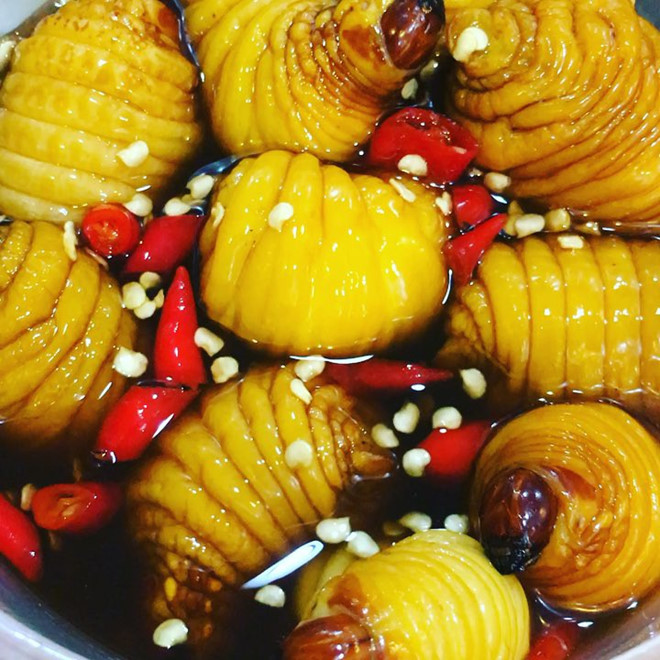Sau khi sơ chế sạch, cho một vài hạt lạc vào trong thân đuông, lăn qua hỗn hợp bột mì, bột năng, trứng gà, chút hồ tiêu tán nhuyễn, muối, đem chiên vừa độ vàng trong chảo mỡ sau đó đảo qua bơ cho thơm vàng. Sau khi chiên, để cho ráo mỡ, kẹp cùng với rau sống để ăn cho đỡ ngấy.