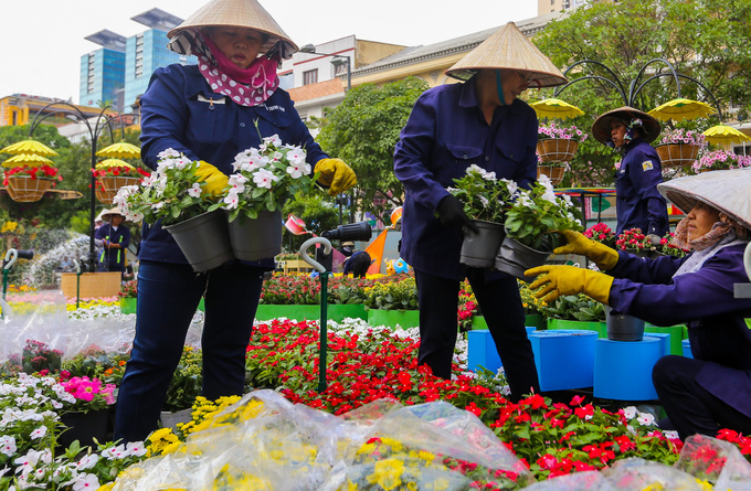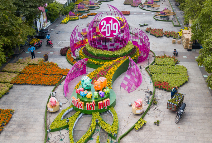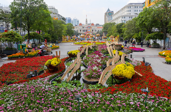 Sau nửa tháng thi công, đường hoa Nguyễn Huệ xuân Kỷ Hợi đã hoàn thiện cơ bản để kịp khai trương vào 28 Tết. Đây là năm thứ 16, TP HCM tổ chức đường hoa.