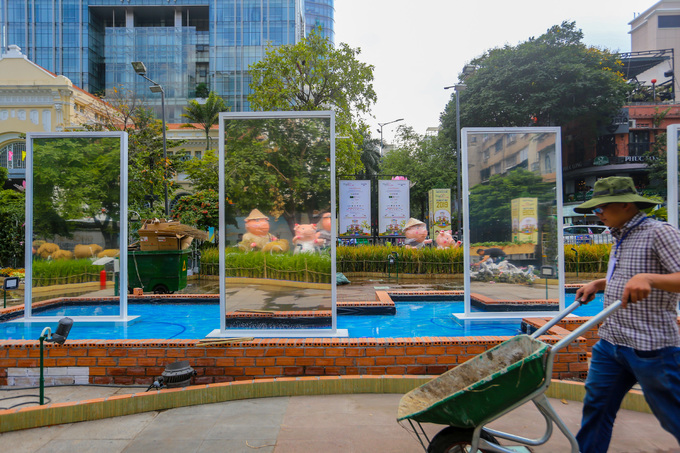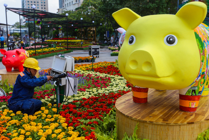 Một ngày trước khai mạc, các tiểu cảnh theo từng chủ đề, linh vật heo của đường hoa Nguyễn Huệ (TP HCM) đã cơ bản hoàn thành.