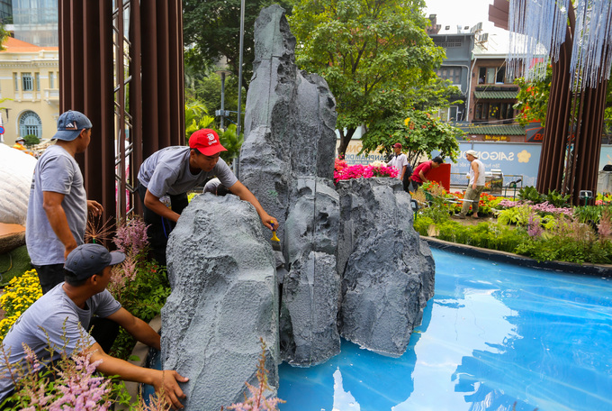Trước ngày khai mạc, công nhân gấp rút hoàn thiện những công đoạn cuối như trang trí hoa ở những tiểu cảnh, làm hệ thống điện, chiếu sáng, dọn vệ sinh... từ sáng đến 22h.