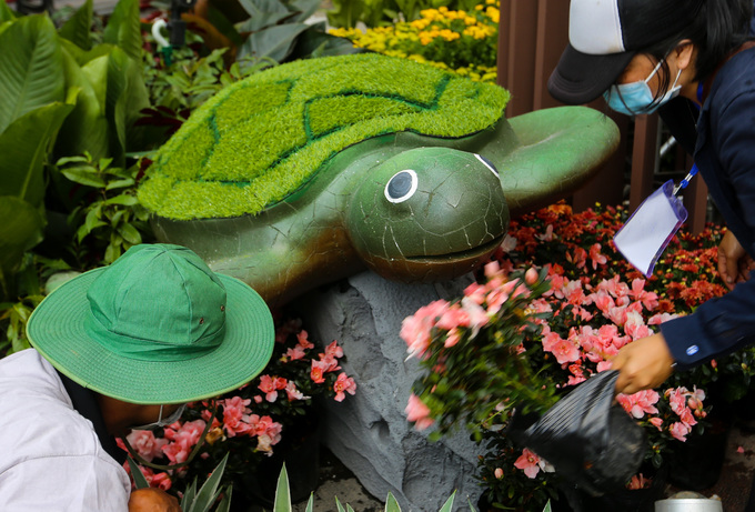 Những loài thú như rùa, cá, ốc, sao biển... đang được lắp đặt, xen kẽ là những chậu hoa đủ màu sắc.