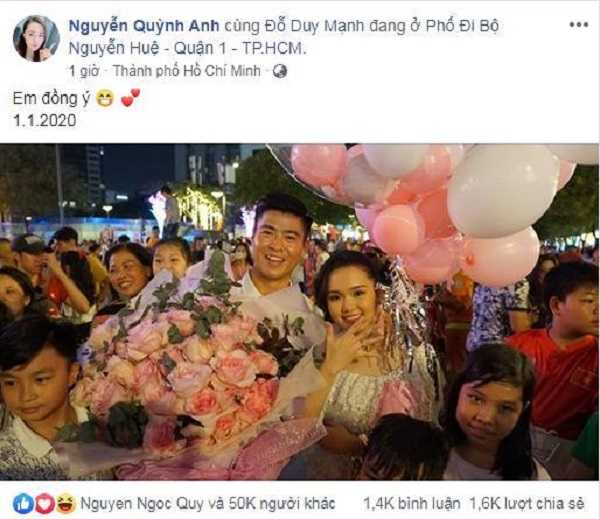 "Đồng ý làm vợ anh nhé" là nội dung dòng trạng thái mà Duy Mạnh đăng tải trên trang Facebook cá nhân tối 1/1, kèm theo đó là tấm ảnh chụp anh và người bạn gái Quỳnh Anh ở phố đi bộ Nguyễn Huệ, TP HCM.