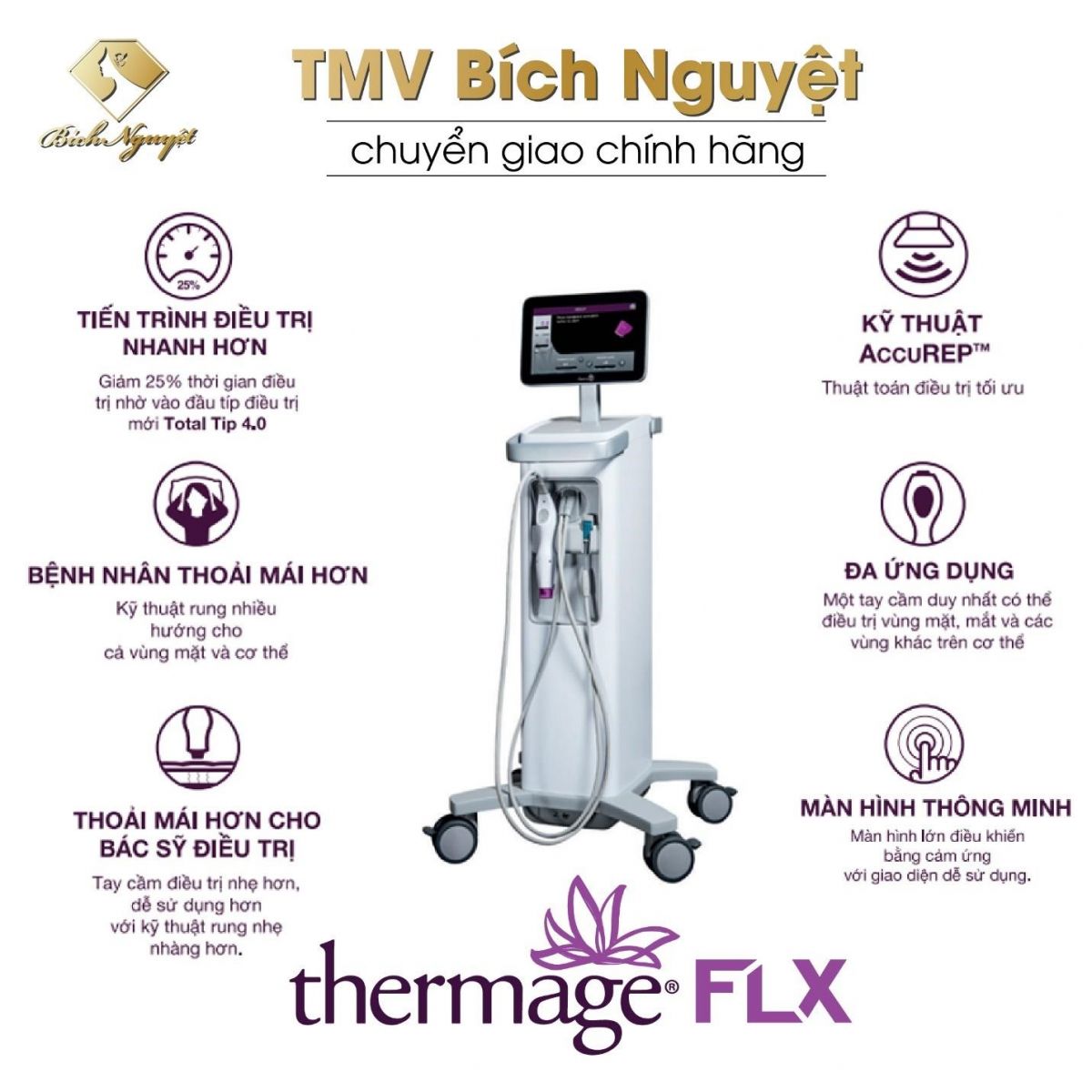 Lưu Bích Nguyệt – Chủ tịch HĐQT Bích Nguyệt Group chia sẻ: “Thermage FLX thực sự chinh phục được nhiều tín đồ làm đẹp Việt với khả năng siêu trẻ hóa thần kỳ. Chính vì vậy, không có lý do gì mà không ứng dụng tại Thẩm mỹ viện Bích Nguyệt để giúp cho hàng triệu phụ nữ lấy lại thanh xuân”.