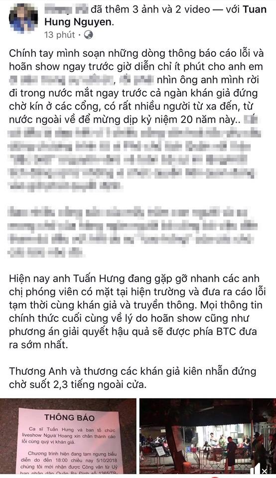 Được biết, trước đó chưa lâu, ông Nguyễn Quang Trung – Phó chủ tịch UBND Quận Ba Đình đã ký công văn hỏa tốc gửi đến Trung tâm Văn hóa – Thông tin và Thể thao Ba Đình thông báo về việc ngừng biểu diễn chương trình ca nhạc Liveshow Tuấn Hưng kỉ niệm 20 năm ca hát. Nội dung công văn ghi rõ: “Vì lý do đặc biệt, Ủy ban nhân dân quận Ba Đình yêu cầu dừng chương trình biểu diễn ca nhạc Liveshow Tuấn Hưng kỷ niệm 20 năm ca hát. Thời gian từ 19h30 đến 22h30 ngày 5/10/2018 (thứ Sáu). Địa điểm: Cung thể thao tổng hợp Quần Ngựa, quận Ba Đình”.