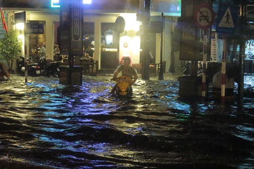 Mưa dồn dập trong thời gian ngắn khiến hàng loạt tuyến đường ngập sâu, hơn 200 m đường Điện Biên Phủ (Ba Đình) nước ngập qúa đầu gối, một số phương tiện chết máy khi cố đi qua đoạn ngập.