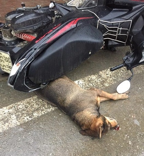 Chưa dừng lại, con chó còn chạy theo cắn một người đàn ông đang đi xe máy. Quá hoảng loạn, người này đã bị ngã xuống đường rồi nhanh chân bỏ chạy. Khi chiếc xe máy bị nghiêng xuống đường thì vô tình đè phải con chó khiến nó bị chết sau đó.