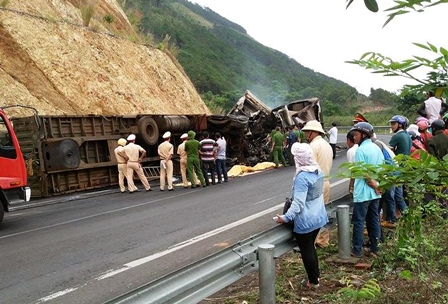 Chạy cùng chiều phía sau xe anh Toàn là xe đầu kéo container chở xoài. Khi qua đèo Mang Yang, chiếc xe đầu kéo chở xoài phía sau, bất ngờ đâm vào đuôi xe đầu kéo chở gỗ phía trước.