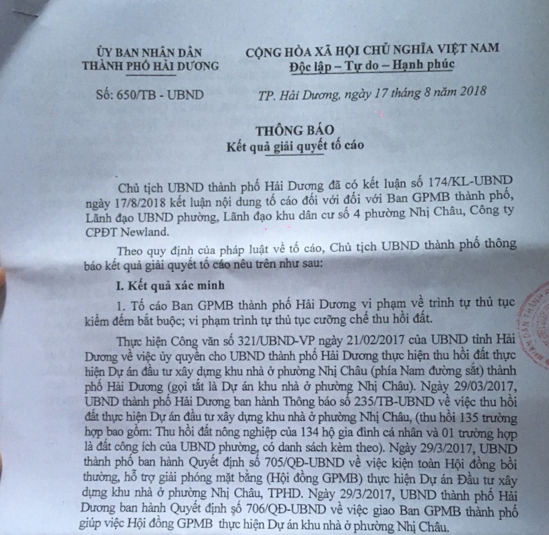 Ngày 17/8/2018, UBND TP. Hải Dương ra thông báo số 650/TB-UBND về kết quả giải quyết tố cáo. Theo đó, việc Công ty CPĐT Newland thực hiện san lấp đất khi chưa hoàn tất công tác GPMB trên 18/49 thửa khoảng 3.318,9 m2 đất là trái quy định của pháp luật.