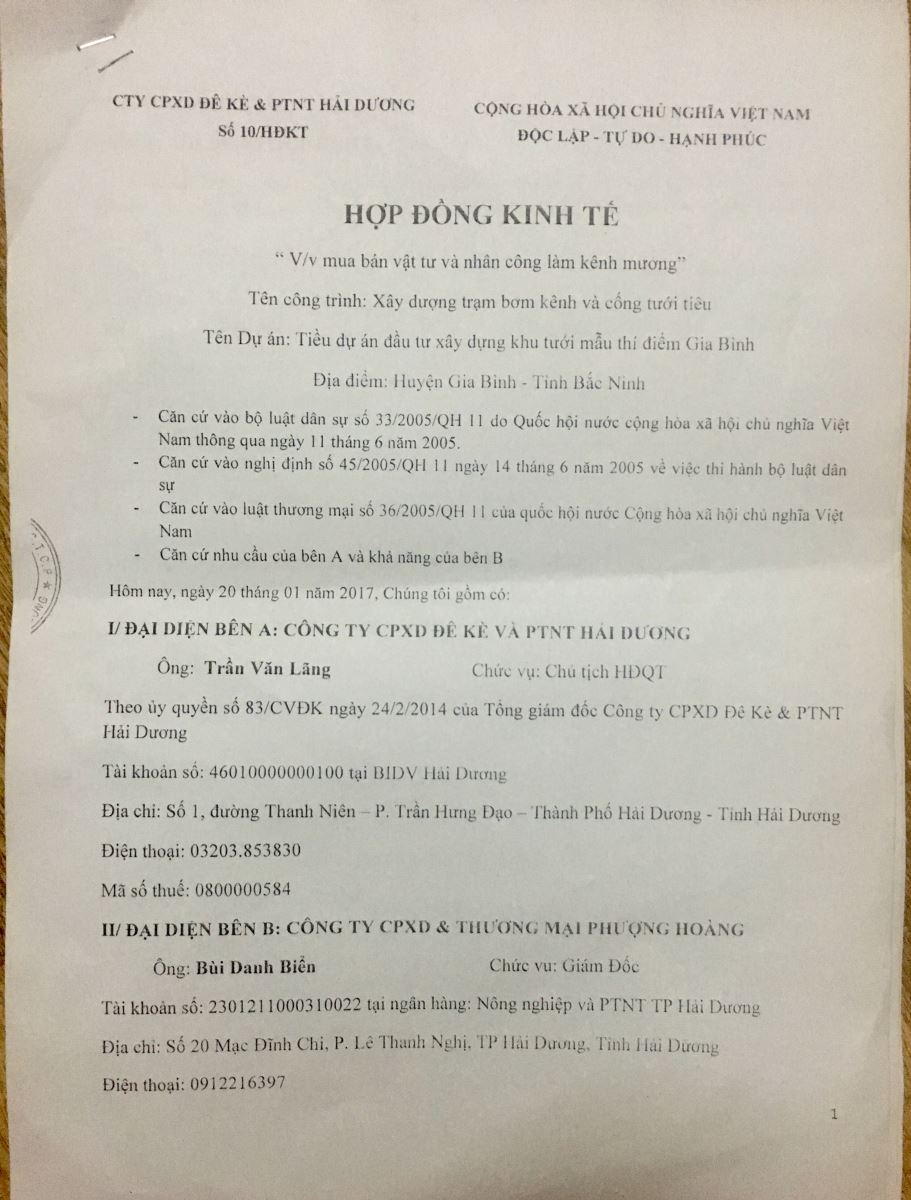Từ thỏa thuận liên danh trên, ngày 20/1/2017, Công ty CPXD đê kè và PTNT Hải Dương (Bên A) và công ty ông Biển (Bên B) đã ký kết Hợp đồng kinh tế về việc mua bán vật tư và nhân công làm kênh mương.