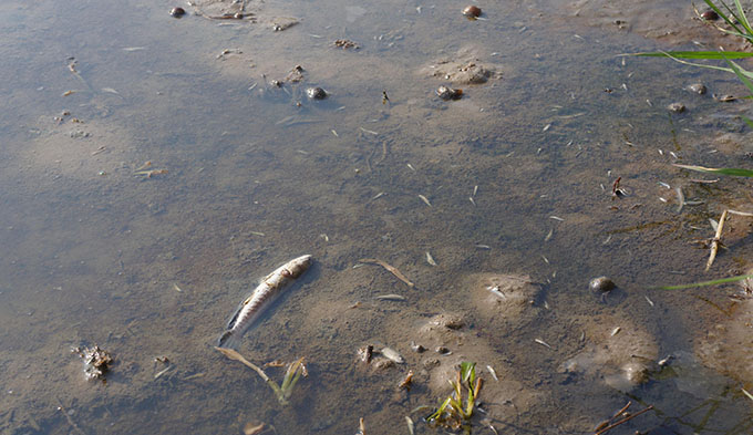 Tại vị trí được xác định là nơi dầu tràn nhiều nhất, thuộc khu phố 5, phường Quảng Hưng, xuất hiện nhiều xác tôm cá. Các loài ốc và lươn chạch sống trong môi trường tự nhiên cũng chết hàng loạt.