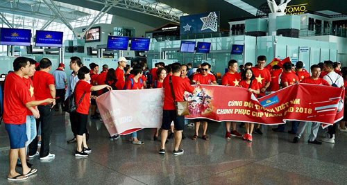 Sáng 27/8, sân bay Nội Bài (Hà Nội) và Tân Sơn Nhất (TP HCM) tràn ngập cổ động viên Việt Nam mang cờ đỏ, băng rôn cùng nhau đến Indonesia cổ động bóng đá. Nhiều người hô vang "Việt Nam chiến thắng", khiến nhiều du khách quốc tế ngạc nhiên và xin chụp ảnh cùng.