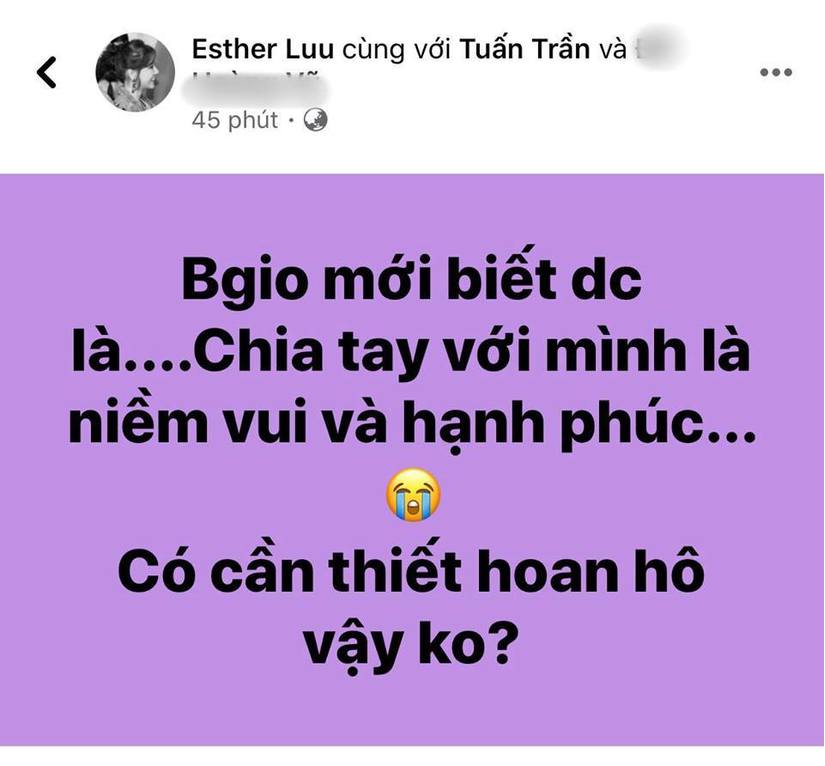 Cụ thể, Hari Won viết: "Bây giờ mới biết được... chia tay với mình là niềm vui và hạnh phúc... Có cần thiết hoan hô vậy không?". Cách diễn đạt này của Hari Won không mới nhưng luôn khiến fan lo lắng, đồng thời thi nhau dự đoán nguyên nhân. Dưới phần bình luận, rất nhiều người đặt câu hỏi để làm rõ sự tình và mong chờ phản hồi từ phía Hari Won. Nếu chỉ đọc nguyên dòng status này nhiều người sẽ không hiểu bà xã Trấn Thành đang muốn nói gì, thậm chí còn hiểu lầm sang việc Hari Won chia tay với Trấn Thành. Vì thế CĐM đồng loạt gọi tên Trấn Thành vào giải quyết.