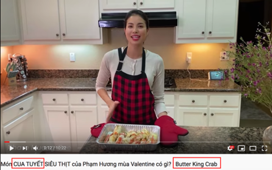 Cụ thể, "King Crab" nghĩa là cua Hoàng Đế nhưng khi đặt tên vlog, Phạm Hương lại để là "cua Tuyết siêu thịt", trong quá trình hướng dẫn chế biến, cô cũng luôn miệng nói đây là "càng cua Tuyết".