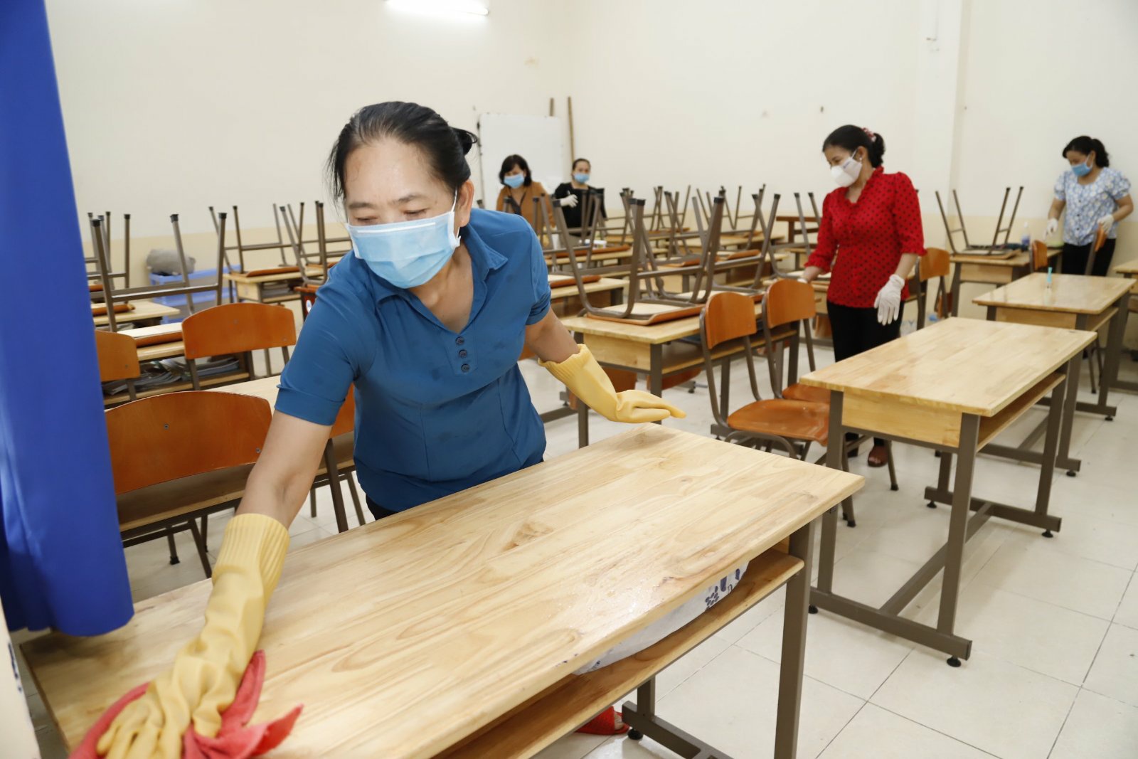 Giáo viên, nhân viên phục vụ, người quản lý, người lao động tại trường phải đeo khẩu trang khi đi đến trường, khi ra về, khi tiếp xúc với khách đến thăm và làm việc, tiếp xúc với người đưa đón học sinh. Khách khi đến thăm, rời khỏi và trong suốt quá trình làm việc tại trường phải đeo khẩu trang.