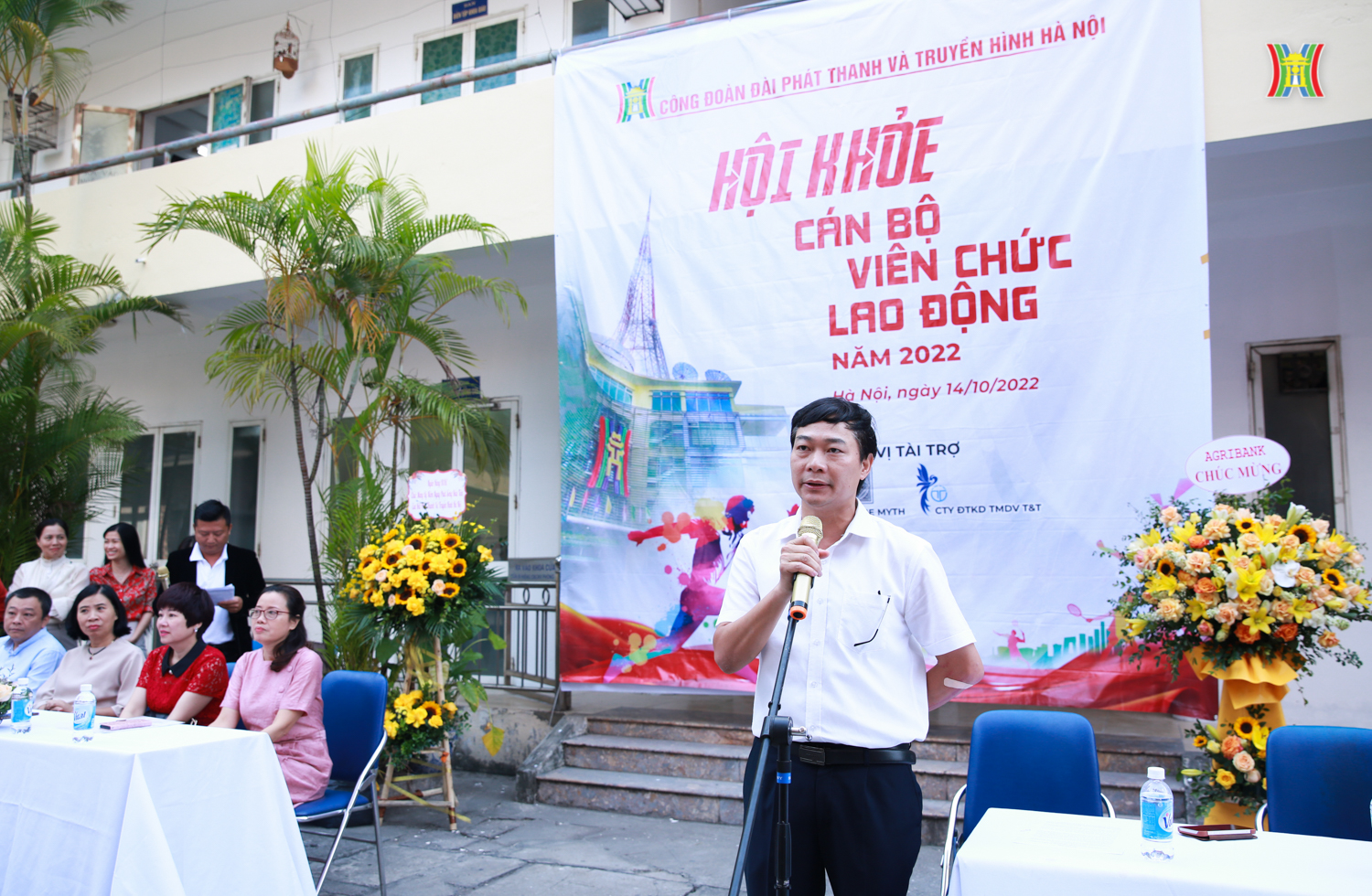 Ông Nguyễn Tiến Dũng, Phó Tổng Giám đốc - Chủ tịch Công đoàn Đài PTTH Hà Nội phát biểu khai mạc, hội khỏe cán bộ, viên chức, người lao động Đài năm 2022 nhằm cổ vũ, động viên phong trào tập luyện thể dục thể thao, tạo tinh thần đoàn kết, giao lưu học tập kinh nghiệm giữa các CBCNV trong toàn Đài, góp phần xây dựng đời sống văn hóa tinh thần, đồng thời khẳng định sự lớn mạnh trong phong trào thể dục thể thao của tập thể Đài PTTH Hà Nội.