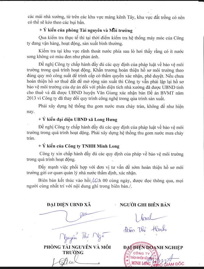 Tiếp nhận thông tin nêu trên, UBND huyện Văn Giang đã chỉ đạo phòng Tài nguyên & Môi trường thành lập Tổ công tác liên ngành kiểm tra đột xuất hoạt động sản xuất kinh doanh cũng như công tác xử lý khí thải, nước thải đảm bảo vệ sinh môi trường của Công ty TNHH Minh Long.
