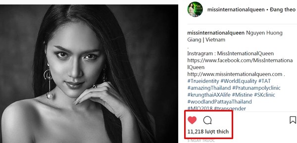 Tương tự ở “mặt trận” Instagram, các fan Việt Nam cũng kéo nhau vào tài khoản của Miss International Queen để “thả tim” cho Hương Giang. Hiện tại, tuy khoảng cách không quá xa nhung lượng like bức ảnh Glamshot của giọng ca Mùa ta đã yêu đã vượt mặt mỹ nhân Argentina.