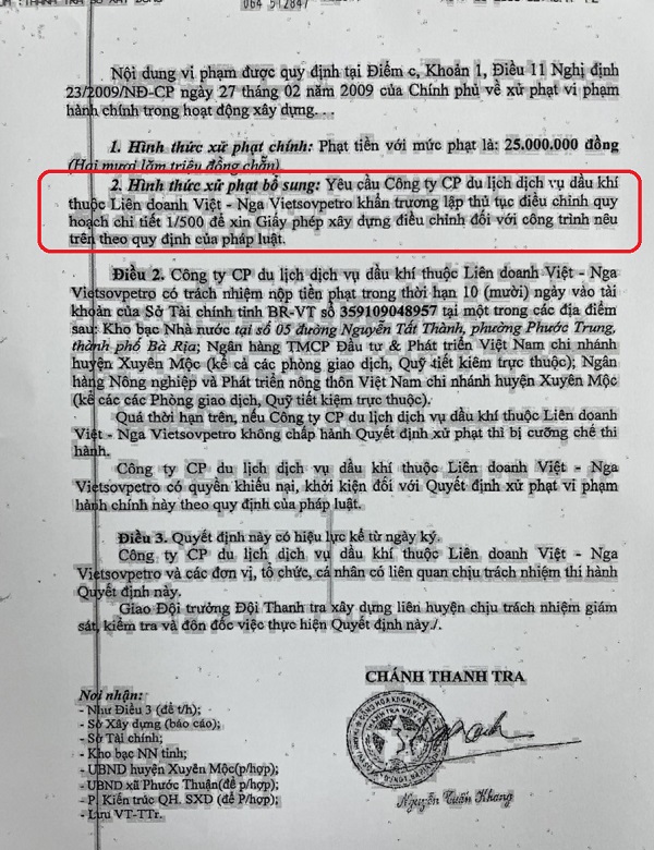 Trước đó, ngày 18/11/2013, Sở Xây dựng tỉnh Bà Rịa – Vũng Tàu đã ban hành Quyết định xử phạt vi phạm hành chính số 14/QĐXP-TTrXD đối với công ty cổ phần du lịch dịch vụ Dầu Khí thuộc Liên doanh Việt – Nga Vietsovpetro về hành vi xây dựng công trình khu du lịch Hồng Phúc tại xã Phước Thuận, huyện Xuyên Mộc sai nội dung so với Giấy phép xây dựng số 53/GPXD với mức phạt tiền 25.000.000 (Hai mươi lăm triệu đồng) kèm theo yêu cầu khẩn trương lập thủ tục điều chỉnh quy hoạch chi tiết 1/500 để xin Giấy phép xây dựng điều chỉnh đối với công trình nêu trên.