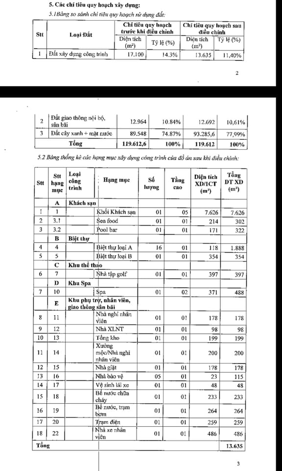 Các chỉ tiêu quy hoạch xây dựng công trình của đồ án sau khi điều chỉnh được thống kê cụ thể: Khối khách sạn sẽ là 1 công trình với 5 tầng cao, diện tích XD/1CT 7.626m2; 01 Seafood 302m2; 01 Poolbar 322m2. Biệt thự loại A: 16 căn, biệt thự loại B: 1 căn. Khu thể thao: 01 nhà tập Golf 397m2. Khu Spa 488m2. Khu phụ trợ nhân viên, giao thông sân bãi 2.258m2… tổng diện tích xây dựng là 13.635m2, mật độ xây dựng 11,40%.