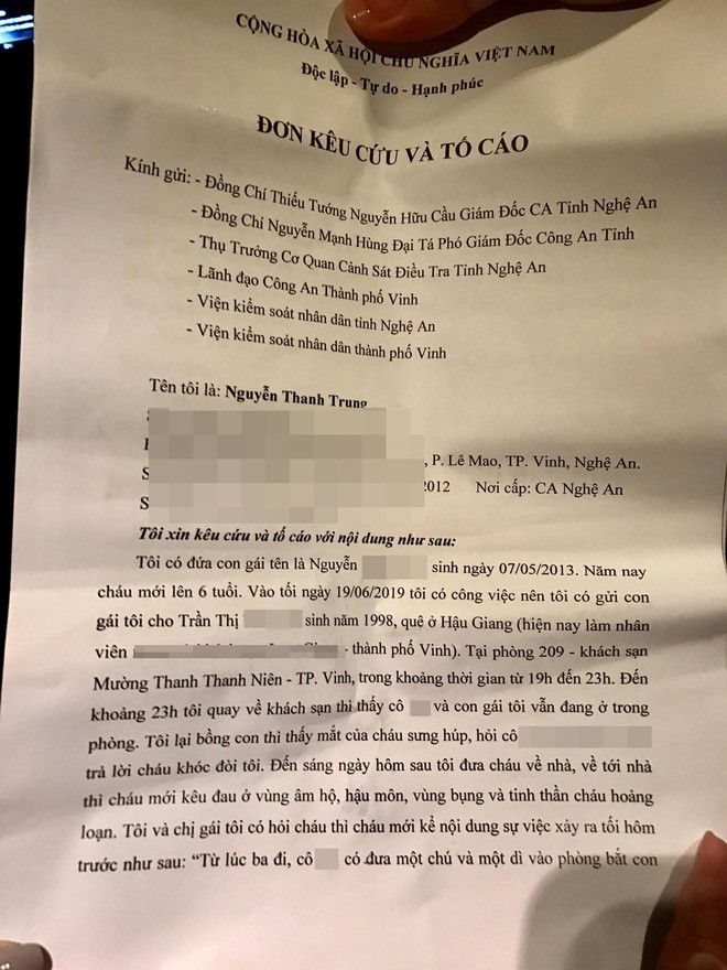 Trước đó, anh Nguyễn Thanh Trung đã có đơn trình báo gửi cơ quan công an về việc nghi con gái bị xâm hại. Theo đơn này, tối 19/6, anh Trung có nhờ chị A trông giúp con gái của mình. Sau đó chị A. đã đưa cháu bé tới khách sạn trên địa bàn TP.Vinh. Đến khuya khi về khách sạn thì anh Trung thấy con khóc. Một ngày sau, bộ phận sinh dục và hậu môn của cháu bé có biểu hiện đau rát, phồng rộp. Qua kiểm tra, phát hiện có nhiều dấu hiệu bất thường nên anh Trung đã đưa con đi khám tại bệnh viện Nhi Nghệ An. Nghi ngờ cháu bị xâm hại tình dục, anh Trung đã làm đơn trình báo cơ quan Công an TP.Vinh.