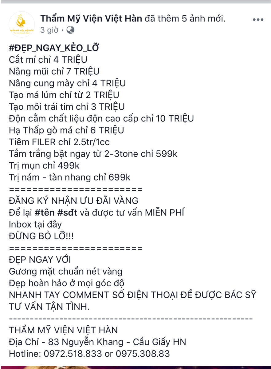 Dù đã được pháp luật quy định rõ ràng nhưng thực tế vì lợi nhuận, cơ sở làm đẹp Việt Hàn có địa chỉ tại số 83 Nguyễn Khang, Cầu Giấy, Hà Nội vẫn có những hoạt động quảng cáo ngang nhiên đi ngược lại với các quy định của pháp luật. Trên nhiều trang mạng xã hội của thẩm mỹ viện này hiện đang quảng cáo rầm rộ về các ngành nghề thẩm mỹ viện có tính chất nội khoa, xâm lấn cơ thể tiêu biểu như: “nâng mũi, cắt mí, độn cằm vline, môi trái tim, tiêm filler…”