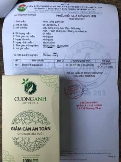 Kết quả kiểm nghiệm của Viện Kiểm nghiệm an toàn vệ sinh thực phẩm Quốc gia cho thấy viên Giảm cân an toàn của Cường Anh có chứa sibutramine (LOD: 3,5ug/g). Theo Từ điển dược phẩm Vidal Việt Nam 2007, sibutramine có chỉ định để điều trị béo phì với liều dùng 10-15mg/ngày. Liều sử dụng tối đa 15mg/ngày. Thuốc gây các phản ứng phụ chán ăn, táo bón, khô miệng, mất ngủ, nhịp tim nhanh, đánh trống ngực, tăng huyết áp, giãn mạch, chóng mặt, nhức đầu, lo âu, ra mồ hôi, rối loạn vị giác.