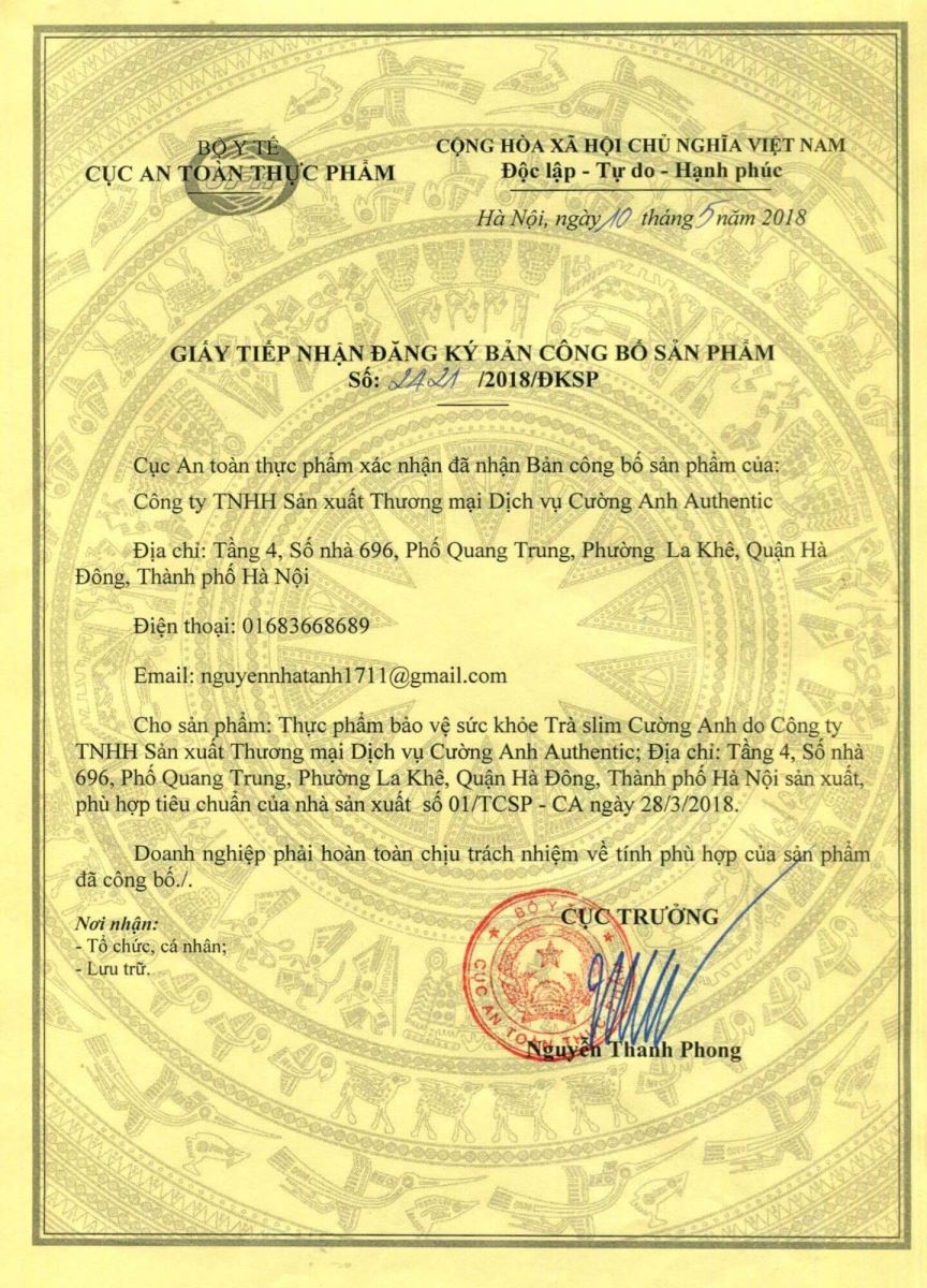 Cụ thể, trong giấy tiếp nhận đăng kí bản công bố sản phẩm của sản phẩm này có ghi xác nhận cấp cho sản phẩm có tên: “Thực phẩm bảo vệ sức khoẻ Trà thảo mộc Cường Anh”, hoàn toàn không phải là Trà giảm cân Cường Anh như nhà sản xuất quảng cáo trên bao bì sản phẩm và các website khác.
