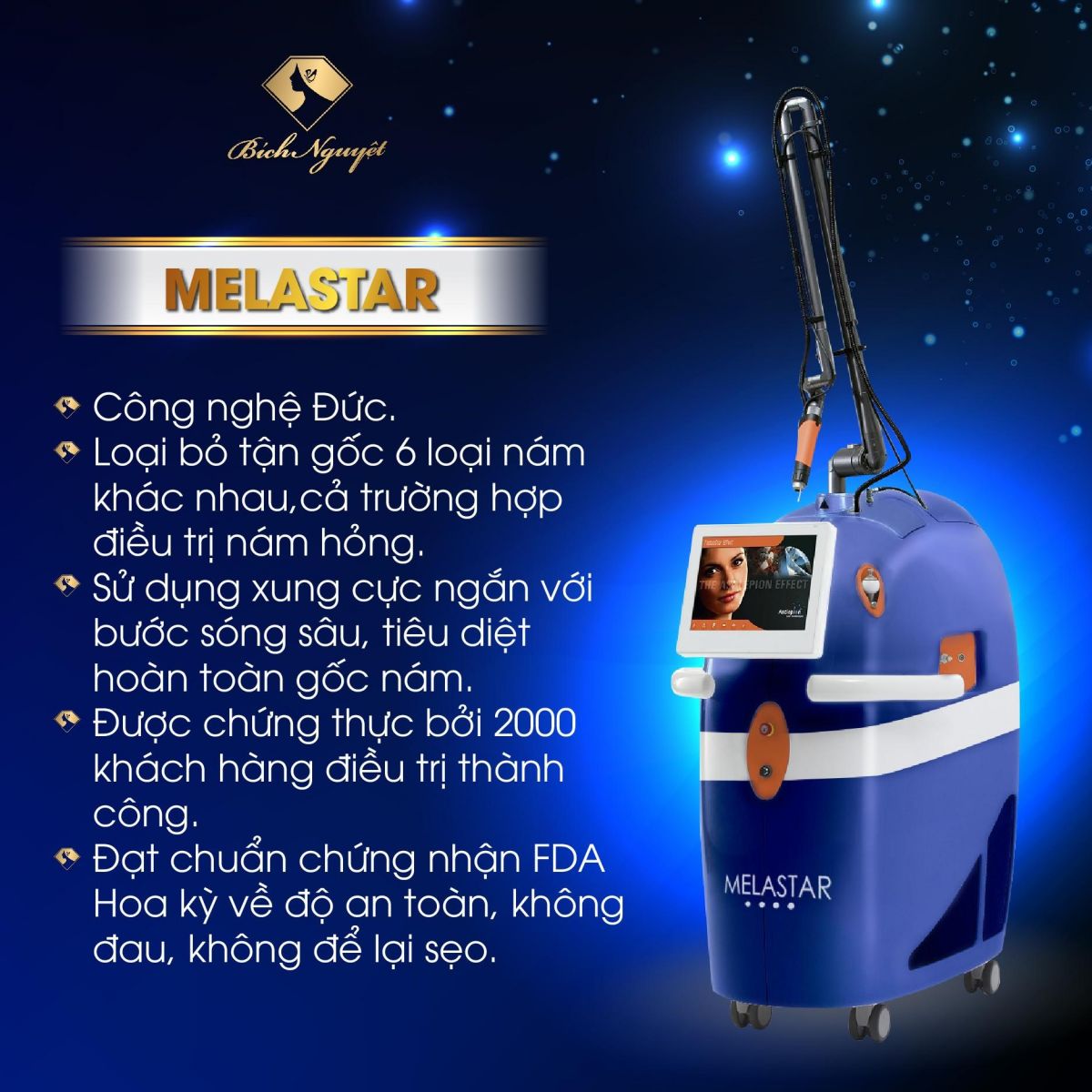 Hiện tại, Bích Nguyệt là một trong những đơn vị hiếm hoi sở hữu cả 3 công nghệ trị nám tiền tỷ. Với tổ hợp công nghệ tân tiến nhất trên thế giới, Melas Ruby tự tin tiêu diệt 6 loại nám, điều trị thành công những ca nám hỏng.