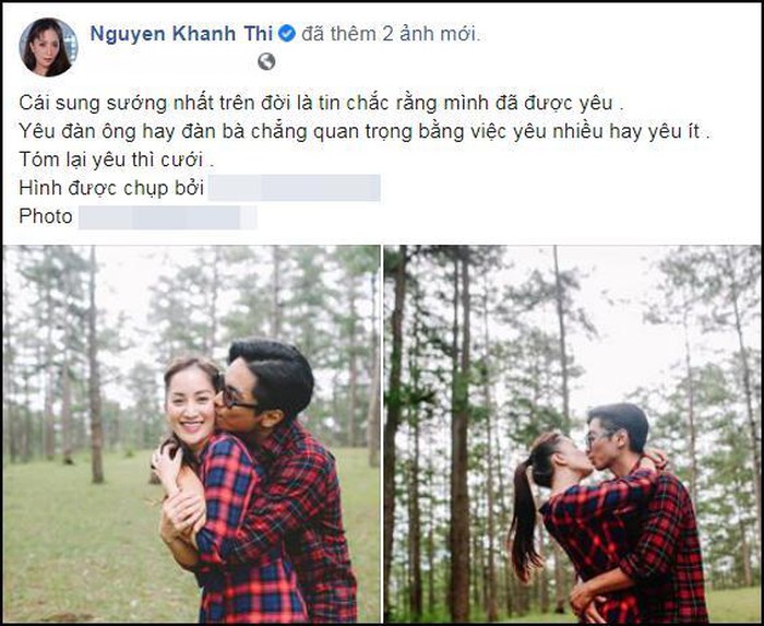 Mới đây, kiện tướng dancesport Khánh Thi đã chia sẻ hình ảnh mặc đồ đồng điệu cùng ông xã, cặp đôi hôn nhau tình tứ giữa khung cảnh thiên nhiên thơ mộng ở Đà Lạt. Đáng chú ý là dòng chia sẻ: "Cái sung sướng nhất trên đời là tin chắc mình đã được yêu. Yêu đàn ông hay đàn bà chẳng quan trọng bằng việc yêu nhiều hay yêu ít. Tóm lại yêu thì cưới".