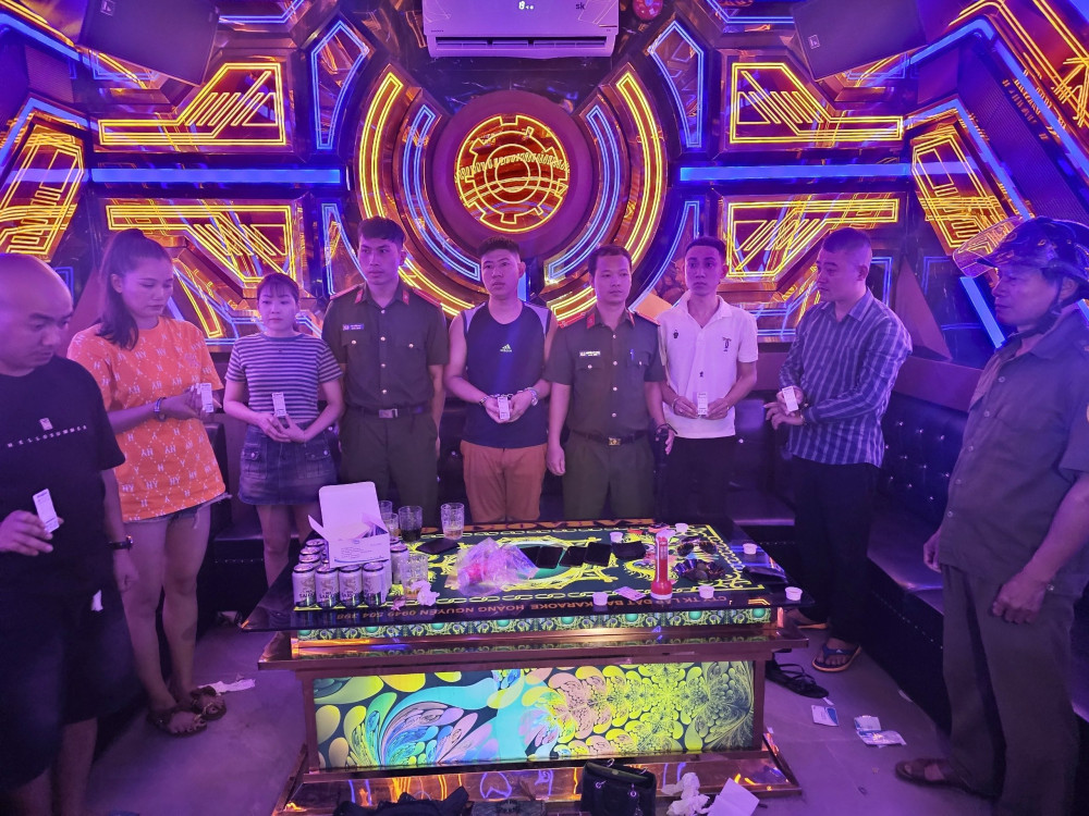 Qua kiểm tra, lực lượng công an phát hiện tại phòng hát số 2 của quán có 6 đối tượng biểu hiện sử dụng trái phép chất ma tuý, thu giữ 1 túi ni lông trong suốt chứa chất tinh thể rắn màu trắng được xác định là ma túy dạng Ketamine, có khối lượng 1,9341 gam. Tiến hành test nhanh ma túy, cả 6 đối tượng đều cho kết quả dương tính.