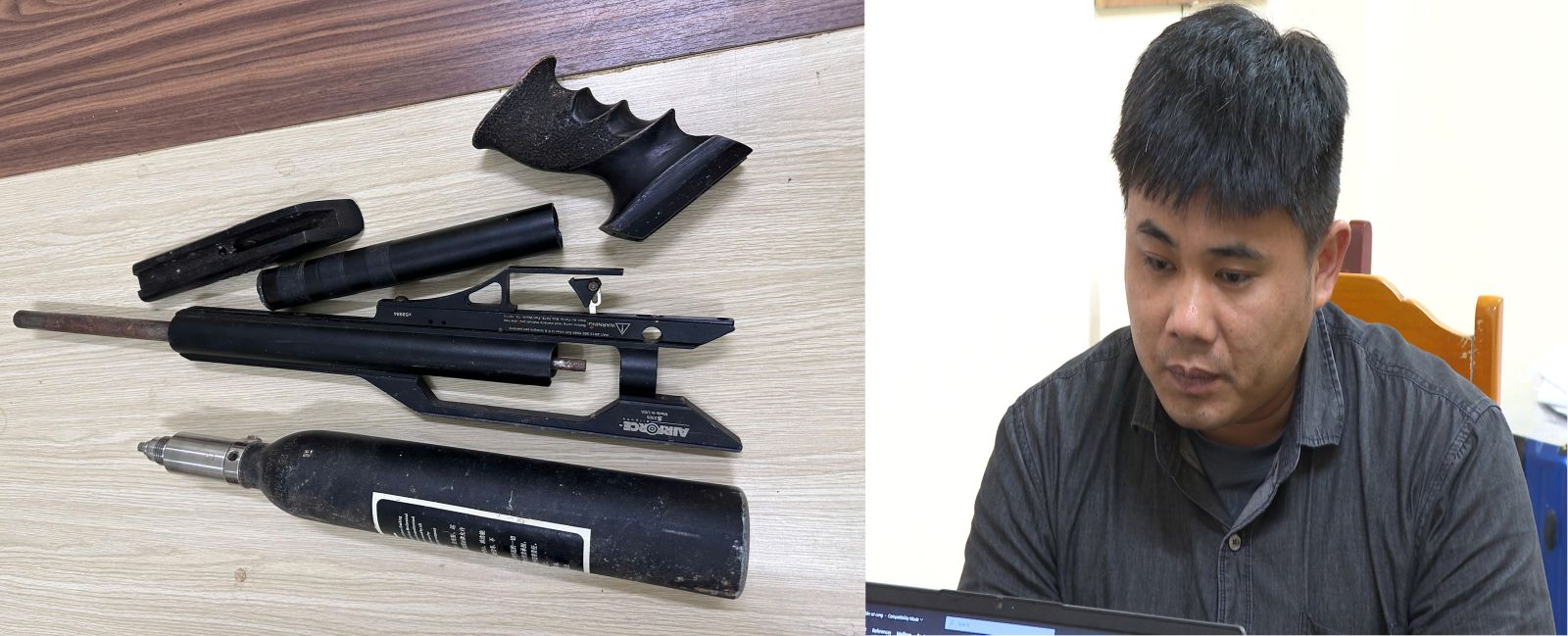 Tại cơ quan Công an, Trần Thanh Tùng đã xin đầu thú và giao nộp cho lực lượng Công an các linh kiện của loại súng nén hơi, nén khí, gồm: thân súng (nòng súng và bộ phận cò súng), ống giảm thanh, tay cầm, ốp tì tay, bình khí và 5 viên đạn chì.