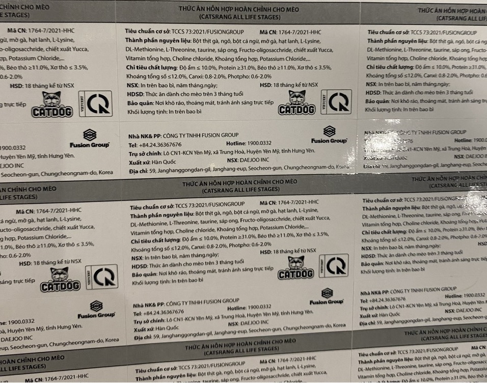 Tại đây, lực lượng chức năng đã phát hiện, thu giữ 380 bao thức ăn hỗn hợp hoàn chỉnh cho mèo trên 3 tháng tuổi, loại 5kg/bao, trên nhãn ghi Catsrang, Chicken & Tuna Recipe, có nhãn phụ ghi nhà NK&PP CÔNG TY TNHH FUSION GROUP, trụ sở chính tại Lô CN 1-KCN Yên Mỹ, xã Trung Hoà, huyện Yên Mỹ, tỉnh Hưng Yên là hàng hoá có nhãn hàng hoá ghi chỉ dẫn giả mạo tên, địa chỉ tổ chức nhập khẩu, phân phối hàng hoá.