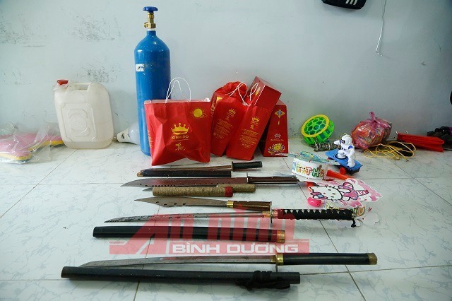 Khám xét nơi ở của các đối tượng, công an thu giữ 4 hộp bánh trung thu, 2 lồng đèn, xe ô tô, cùng nhiều hung khí, và phát hiện 17 thanh thiếu niên đang phê ma túy.