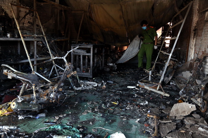 "Gia đình tôi có 4 người, nghe tiếng nổ tôi tưởng tai nạn trước nhà nên mở cửa chạy ra. Thấy biển lửa phía trước, tôi chạy vào hô hoán cả nhà chạy ra cửa sau thoát nạn", bà Lan Hương, một chủ cửa hàng trong vụ cháy, kể lại.