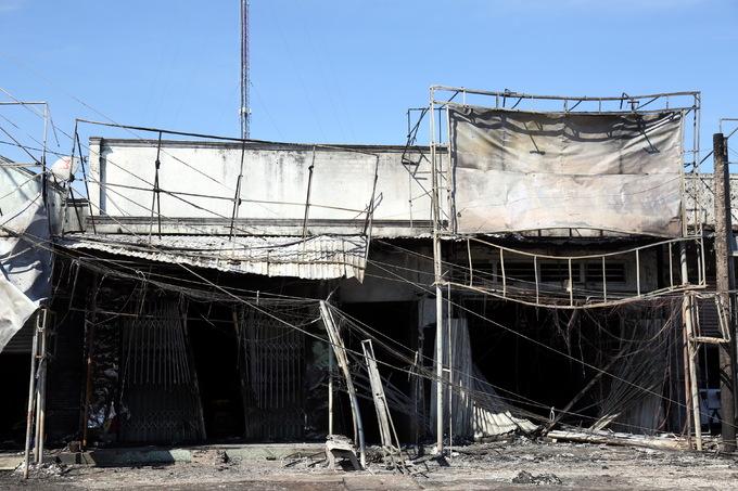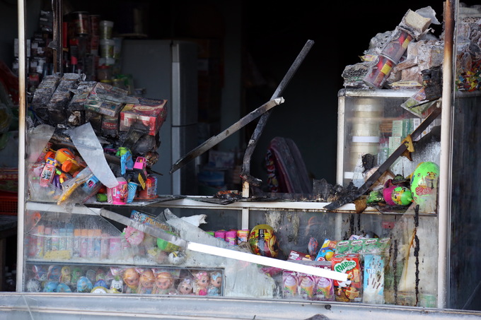 Tiệm tạp hóa cháy nham nhở. Theo người dân, cửa hàng nào mở cửa thì bị cháy nhiều, còn không mở cửa thì cháy ít hơn, do lửa từ xăng chảy tràn trên đường táp vào.
