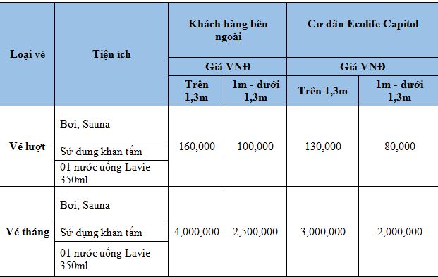 Bảng giá khuyến mại áp dụng trong tháng khai trương Bể bơi EcoLife Capitol