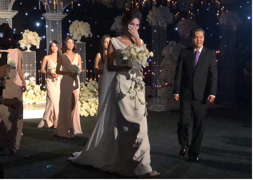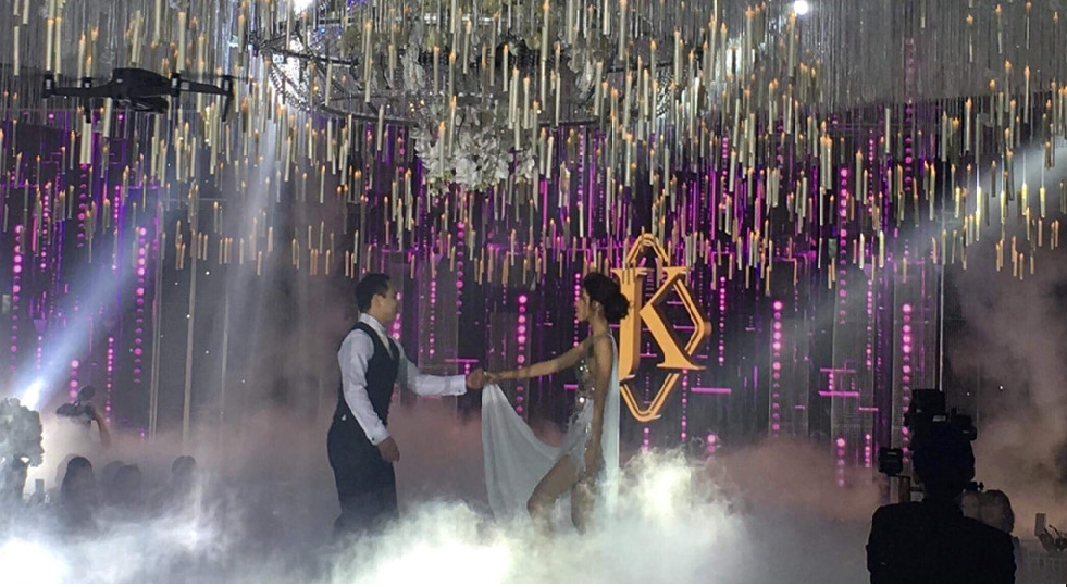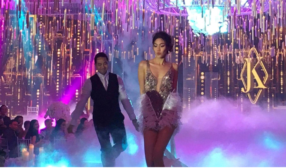 Đúng 19h30, tiệc cưới được bắt đầu. MC Nguyễn Cao Kỳ Duyên đảm nhận dẫn dắt sự kiện vì có mối quan hệ thân thiết với gia đình Tuấn John. Sau tiết mục múa mở đầu, Lan Khuê diện váy cưới lộng lẫy, xuất hiện từ cuối sân khấu bước lên lễ đường. Cô vừa đi vừa lấy tay che giấu những giọt nước mắt hạnh phúc trong tiếng reo hò của khách mời. Tuấn John xuống dưới nắm tay vợ bước vào khu vực chính của buổi tiệc.