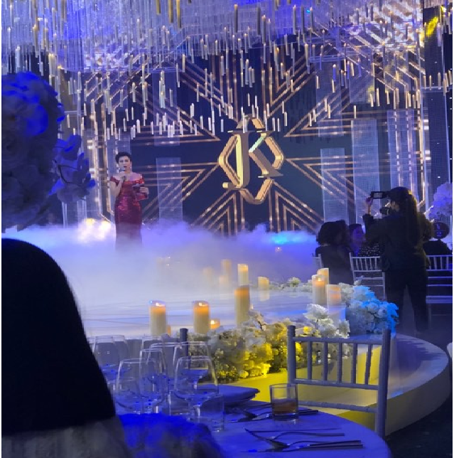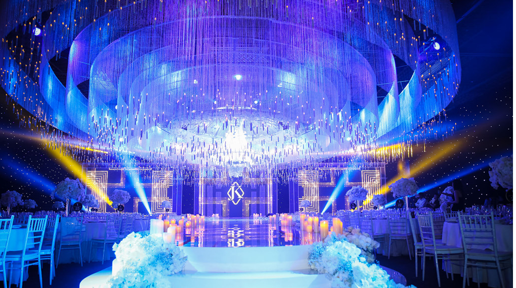 Không gian tiệc cưới được phủ tông trắng, được trang trí bằng hoa hồng và dây pha lê. Riêng sân khấu nổi bật với chùm đèn pha lê khổng lồ. Phía Lan Khuê tiết lộ, trong lễ cưới cô dâu chú rể sẽ có một tiết mục đặc biệt.