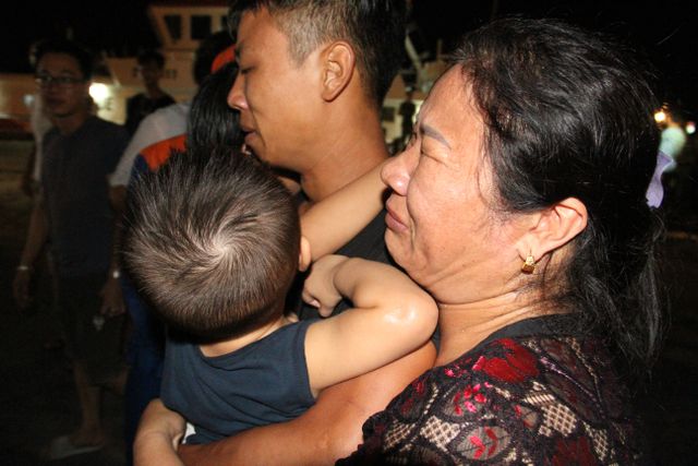 Bà Bùi Thị Liên đưa 2 cháu nhỏ đến tận cảng Cửa Lò để đón con trai là thuyền viên Đinh Trọng Hậu. Chỉ đến khi nhìn thấy con trai bà mới dám tin anh còn sống. Anh Hậu ôm chặt lấy hai con thơ đi bên cạnh người mẹ già đang khóc nức nở trong giây phút đoàn viên.