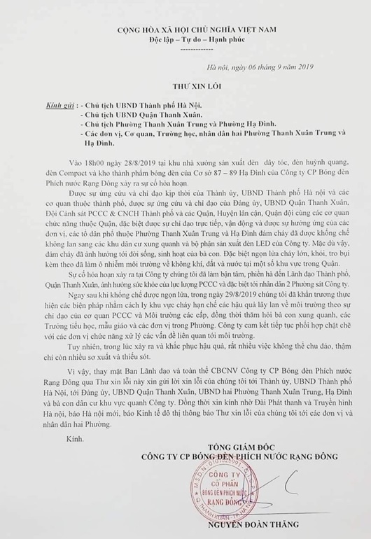 Vì vậy, thay mặt Ban lãnh đạo và toàn thể cán bộ công nhân viên Công ty Cổ phần Bóng đèn Phích nước Rạng Đông qua Thư xin lỗi này, xin gửi lời xin lỗi của chúng tôi đến lãnh đạo Thành phố, cơ quan ban ngành và bà con nhân dân sinh sống quanh khu vực", Tổng giám đốc Công ty Rạng Đông Nguyễn Đoàn Thăng viết trong thư.