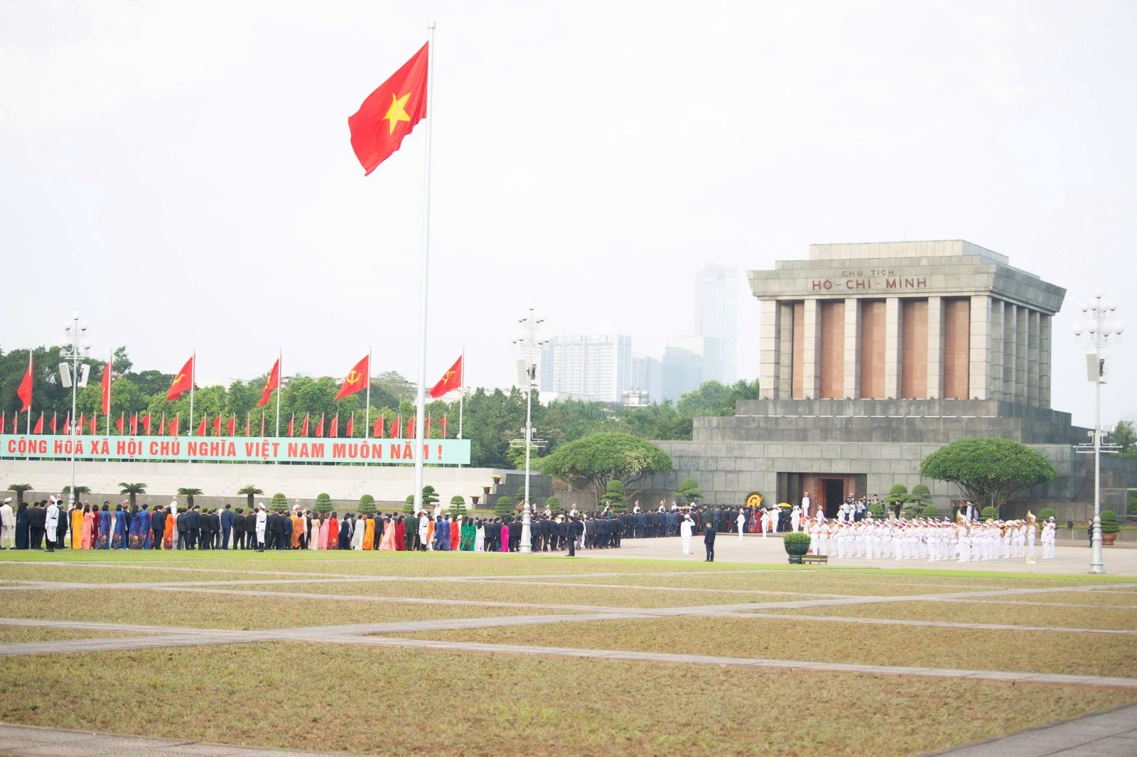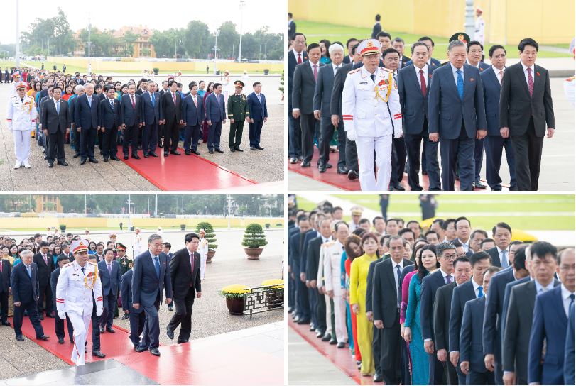 Tổng Bí thư Tô Lâm, Chủ tịch nước Lương Cường, Thủ tướng Phạm Minh Chính, Chủ tịch Quốc hội Trần Thanh Mẫn cùng các đại biểu Quốc hội đặt vòng hoa và vào Lăng viếng Chủ tịch Hồ Chí Minh (Ảnh: Media Quốc hội).