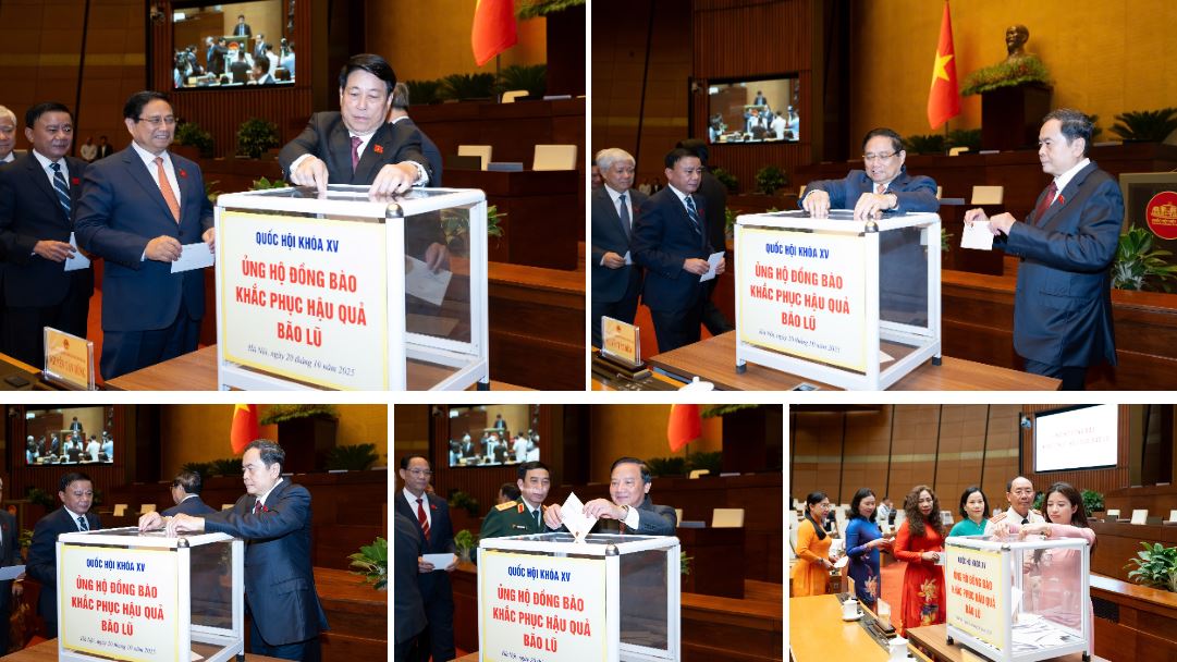 Trước khi bắt đầu phiên khai mạc Kỳ họp thứ 10, lãnh đạo Đảng, Nhà nước, đại biểu Quốc hội các tỉnh, thành phố đã ủng hộ đồng bào, khắc phục hậu quả bão lũ.