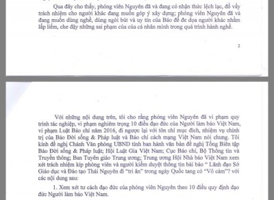 Để rộng đường dư luận và trả lời nội dung đơn của ông Lộc, báo Đời sống và Pháp luật xin đăng tải nội dung công văn đề nghị lãnh đạo tỉnh Thái Nguyên xem xét xử lý việc vu khống, xúc phạm danh dự và đe dọa, cản trở phóng viên tác nghiệp đúng pháp luật của các ông Chánh Văn phòng, chuyên viên văn phòng UBND tỉnh Thái Nguyên.